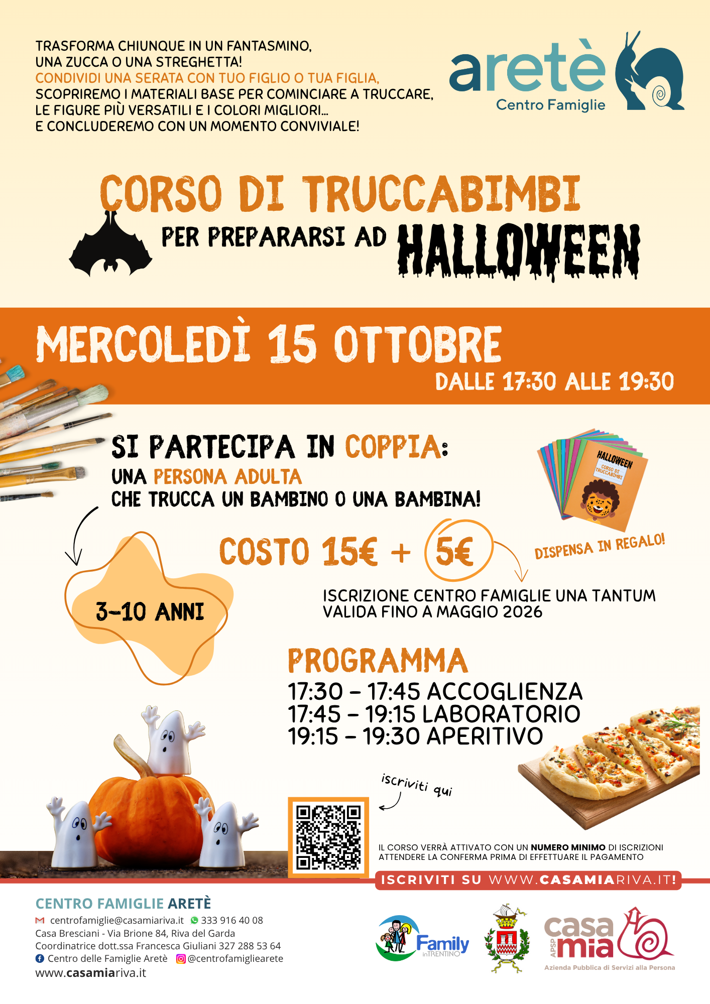 Costo 15 euro a coppia (+ 5 euro di iscrizione al Centro Famiglie Aretè): l'iscrizione di un/a minore comprende l'iscrizione dell'adulto/a che trucca.