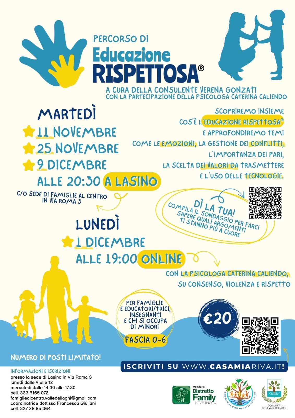 Il Corso si terrà nelle giornate di MARTEDI' 11/11, 25/11 e 9/12 dalle 20:30 alle 21:30 presso la sede di Famiglie al Centro; nella giornata di LUNEDI' 1/12 dalle 19:00 alle 20:00 via Zoom (il link verrà inviato ai partecipanti).